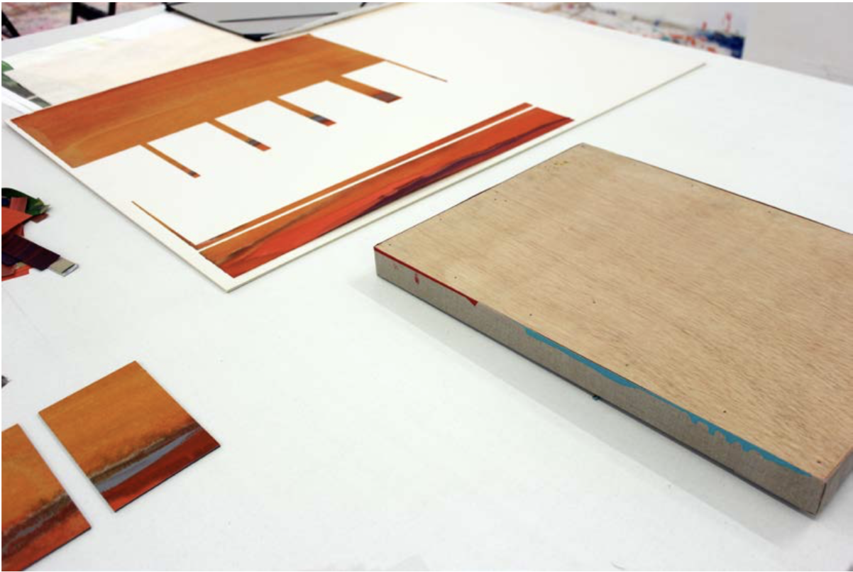 Partiendo de este cuestionamiento y la idea de que los límites de la ciudad son siempre perceptibles de manera clara en el plano pero no en el terreno, establezco ciertas relaciones con la pintura. Esos intereses se centran principalmente, en el límite físico como elemento generador de puntos de atención continuo. A partir de la línea, sea esta creada de manera directa con un lápiz, venga de una superposición, sea provocada por un preciso corte o esté generada de manera natural por el comportamiento acuoso de la pintura diluida, los límites que crea agudizan las capacidades de percepción ante la aparente uniformidad.